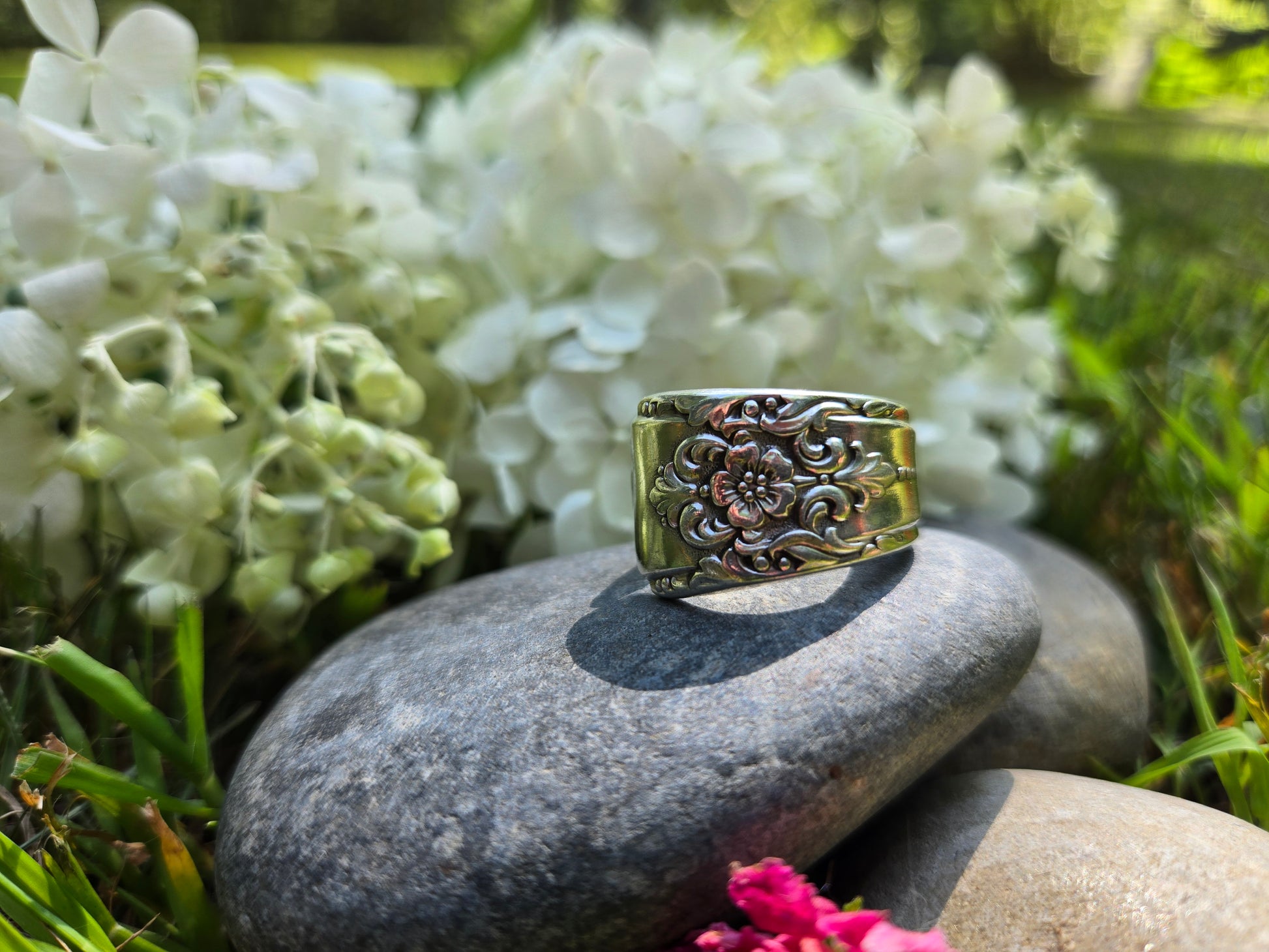 Experience timeless elegance with the Adoration Ring by 1847 Rogers Bros International. This silver-plated spoon ring features the intricate "ADORATION" pattern, adding a touch of luxury to any outfit. Indulge in the exquisite craftsmanship and elevate your style with this exclusive piece.