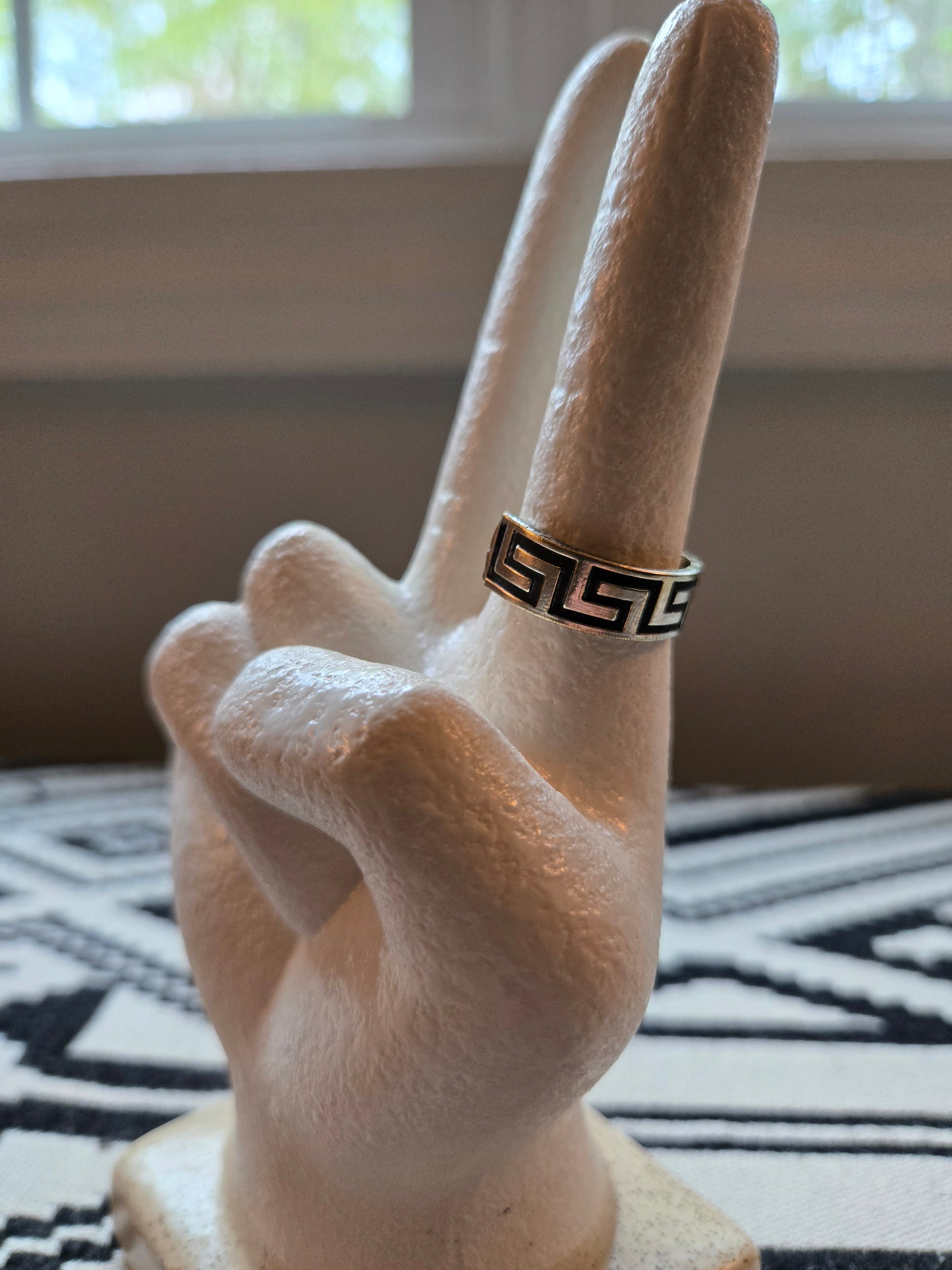 "Embrace your desire for adventure with this Athens Ring crafted from a souvenir spoon! Inspired by the beauty and history of Athens, this bold band symbolizes the courage to take risks and explore new possibilities. Conquer your fears and add this unique piece to your collection. Size 9."