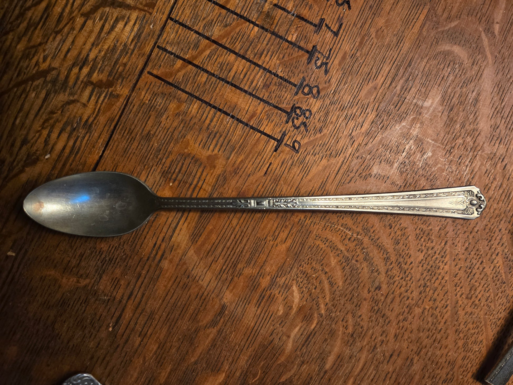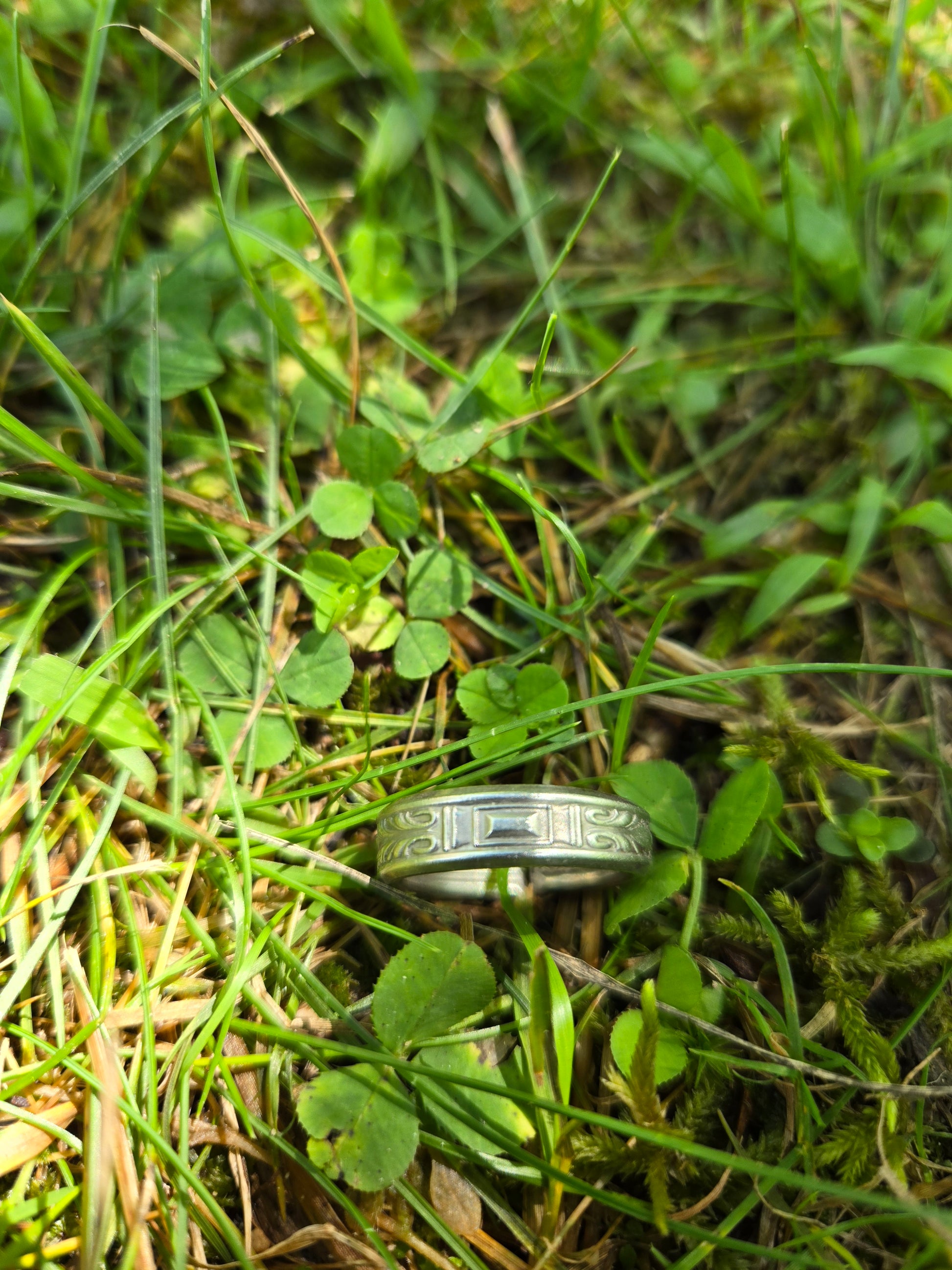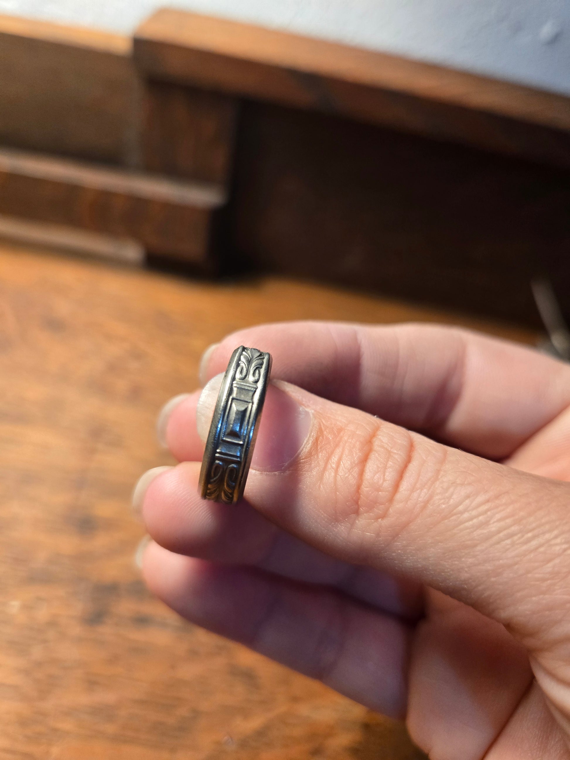 The Exquisite Geometric Ring is made from a vintage ice tea spoon in the iconic "Exquisite" silverplate pattern. This timeless design, originally created in 1940 by Wm Rogers & Son IS, showcases intricate geometric details that add a touch of sophistication to any outfit.