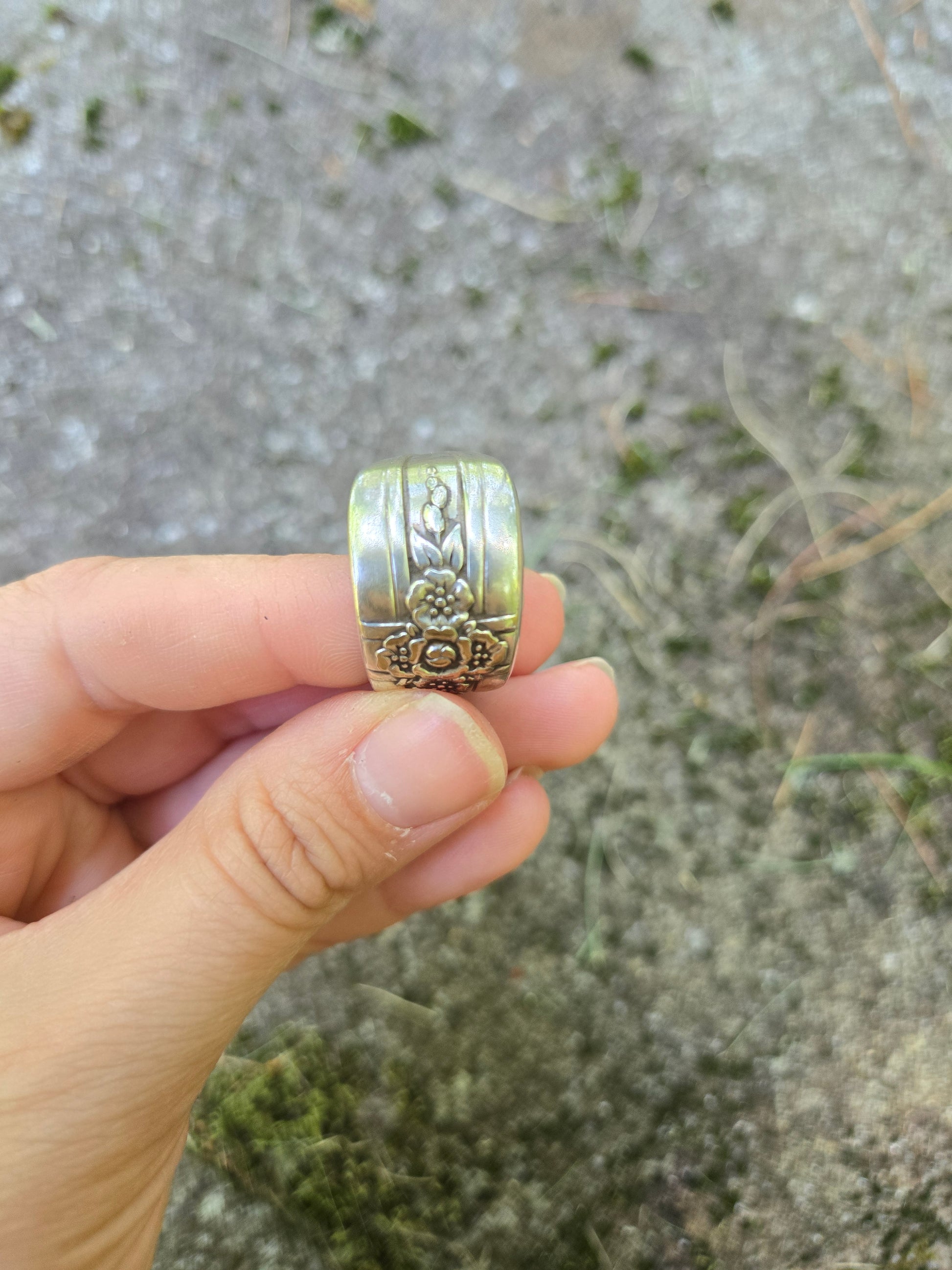 "Indulge in the stunning elegance and boldness of our Spoon Ring, featuring 5 delicate flowers and a striking cross-like design. Transform your look with a touch of sophisticated charm. Perfect for any occasion!"